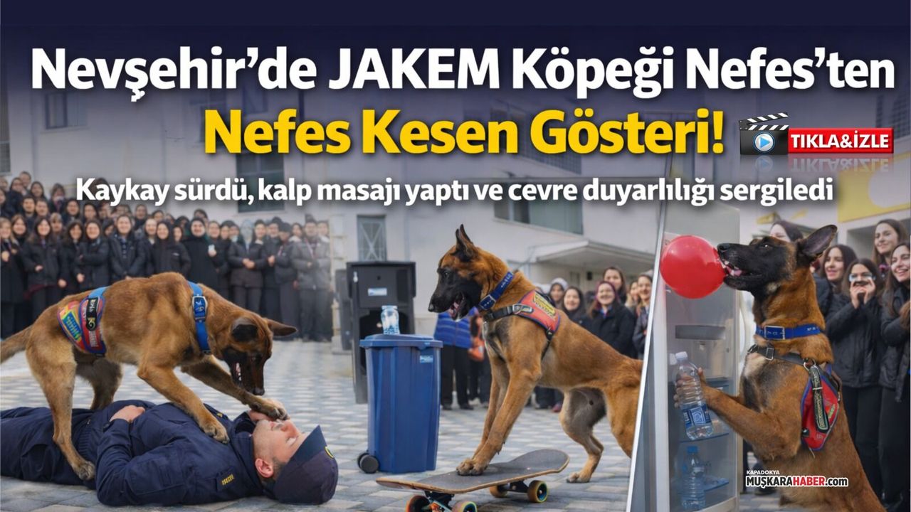 Jandarma At ve Köpek Eğitim Merkezi (JAKEM) Komutanlığı’nda eğitilen ‘Nefes’ isimli Belçika Malinois ırkı itaat köpeği, Nevşehir Demet Sezen Güzel Sanatlar Lisesi'nde sergilediği gösteriyle öğrencilerden tam not aldı. Nefes’in sergilediği hünerler, izleyenleri hem şaşırttı hem de hayran bıraktı.