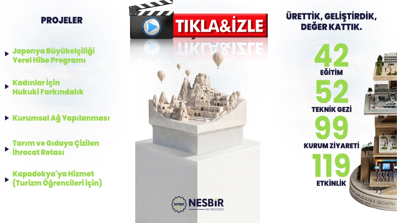 Yayımlanan tanıtım videosu, NESBİR’in geride kalan 8 yıllık süreçte ekibin üreten, analiz eden, raporlayan ve çözüm odaklı yaklaşımıyla Nevşehir iş dünyasına değer katmaya devam ettiği vurgulandı.